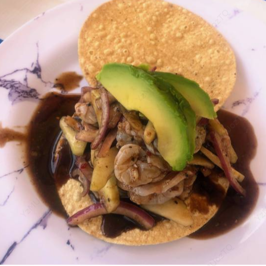 Tostitos cubiertos con una orden de ceviche de pescado, coronados con aguacate. Contiene mariscos.