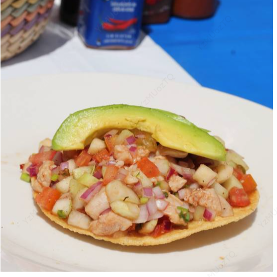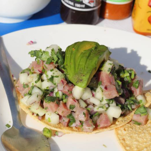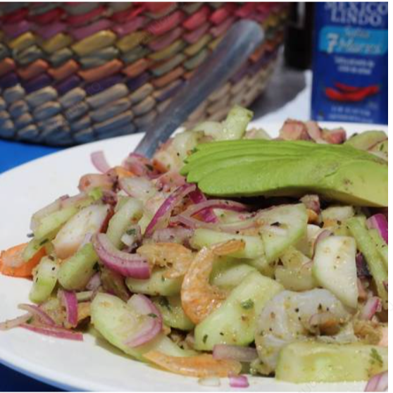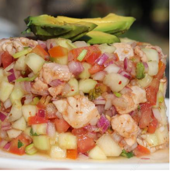 Pescado fresco en cuadritos con pepino, cebolla, jitomate y cilantro. Coronado con aguacate. Contiene mariscos.