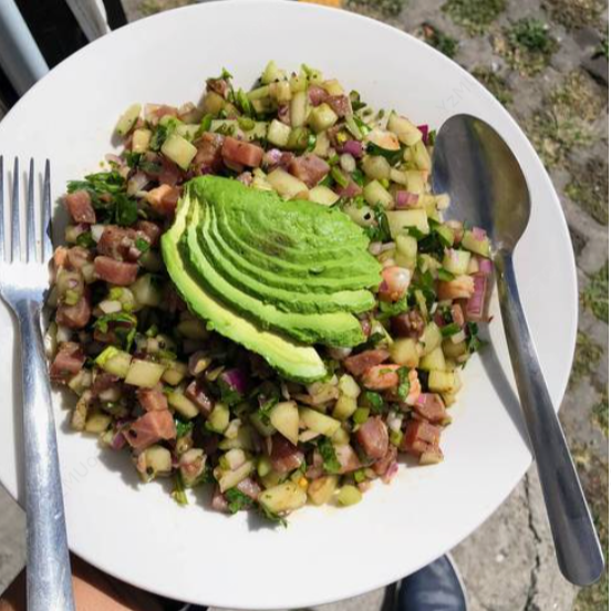 Cubos de atún con pepino, cebolla y cilantro, coronada con aguacate. Contiene mariscos.