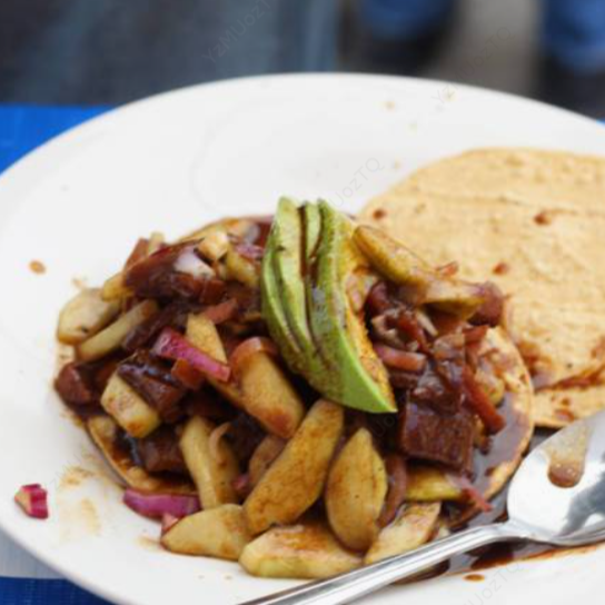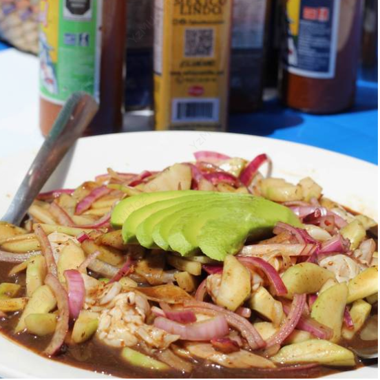 Camarón, crudo, cocido, seco, y calamar. En salsa verde o salsa negra. Contiene mariscos.
