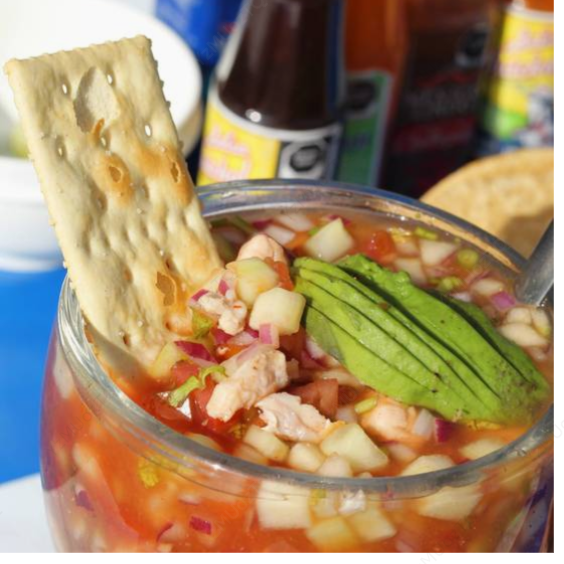 Ceviche de pescado curtido en limón con pepino, cebolla, tomate, cilantro, clamato y salsa especial de la casa. Contiene mariscos.