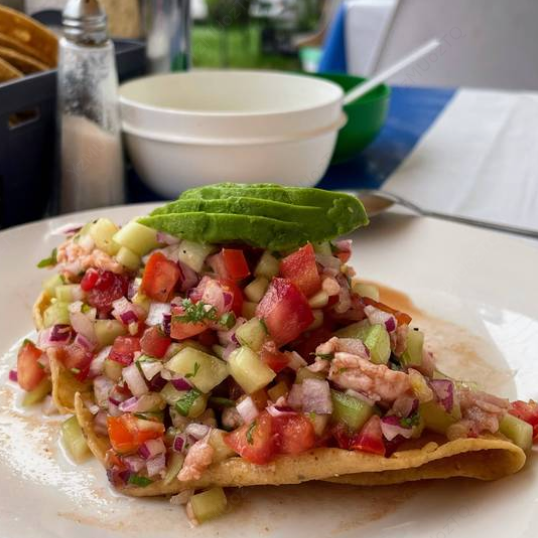 Tostada de ceviche de camarón cocido con pepino, cebolla, tomate, cilantro, limón, Clamato y salsa negra de la casa, coronada con aguacate.