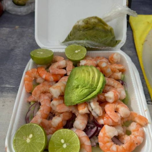 Camarón cocido, salsa especial de la casa, limón, consomé de camarón. Contiene mariscos.