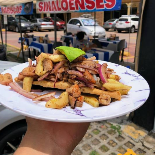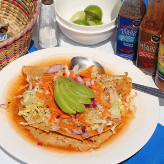 Con camarón seco, coronado con verduras (zanahoria , lechuga , cebolla morada) con salsa de la casa. Contiene mariscos.