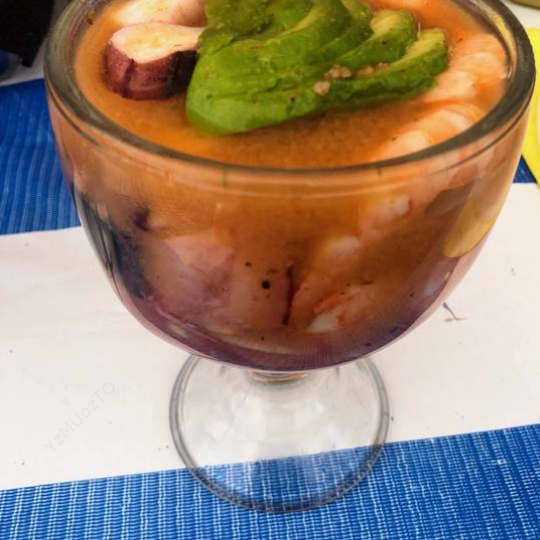Camarones cocidos con lechuga, zanahoria y cebolla, bañada en salsa de tomate, coronada con aguacate. Contiene mariscos.