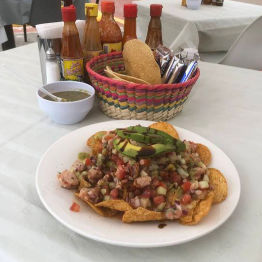 Tostitos cubiertos de aguachile perrón (en salsa verde o negra), coronados con aguacate. Contiene mariscos.