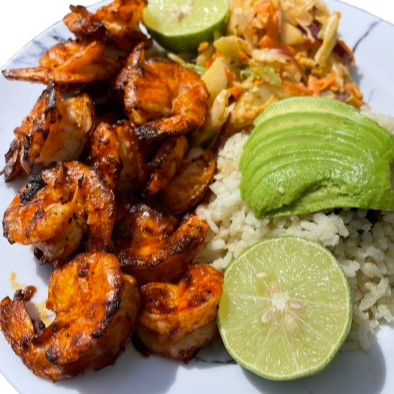 250 gr de Camarones Zarandeados, acompañados de arroz blanco y ensalada de verduras.