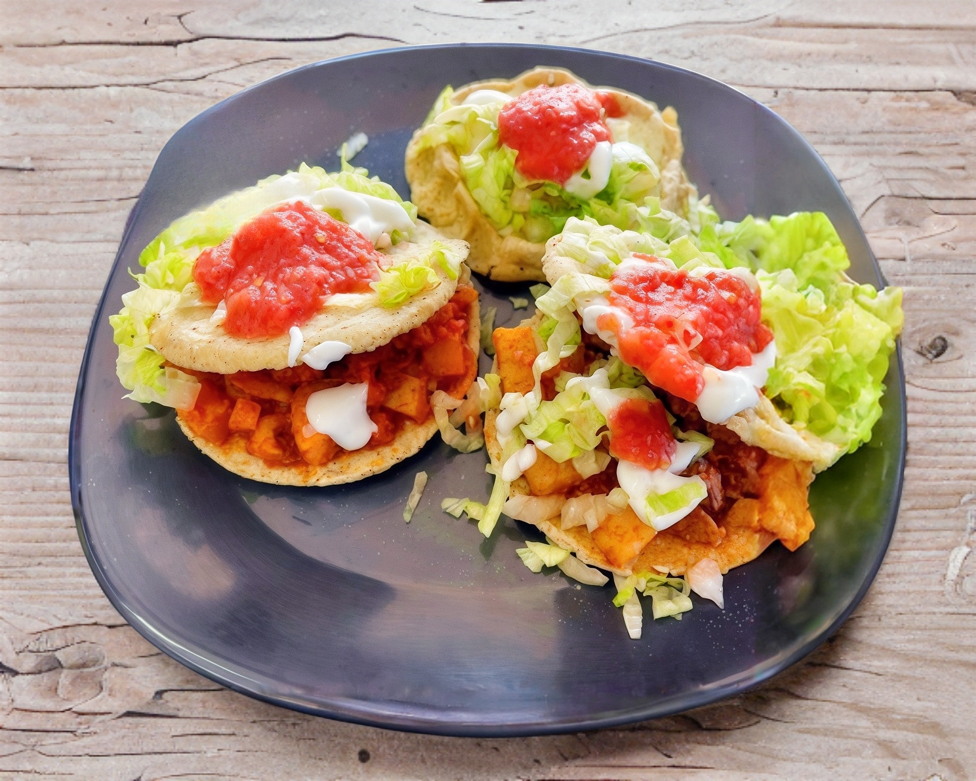 Gordita de masa con guisado a elegir, lechucha, crema y salsa.