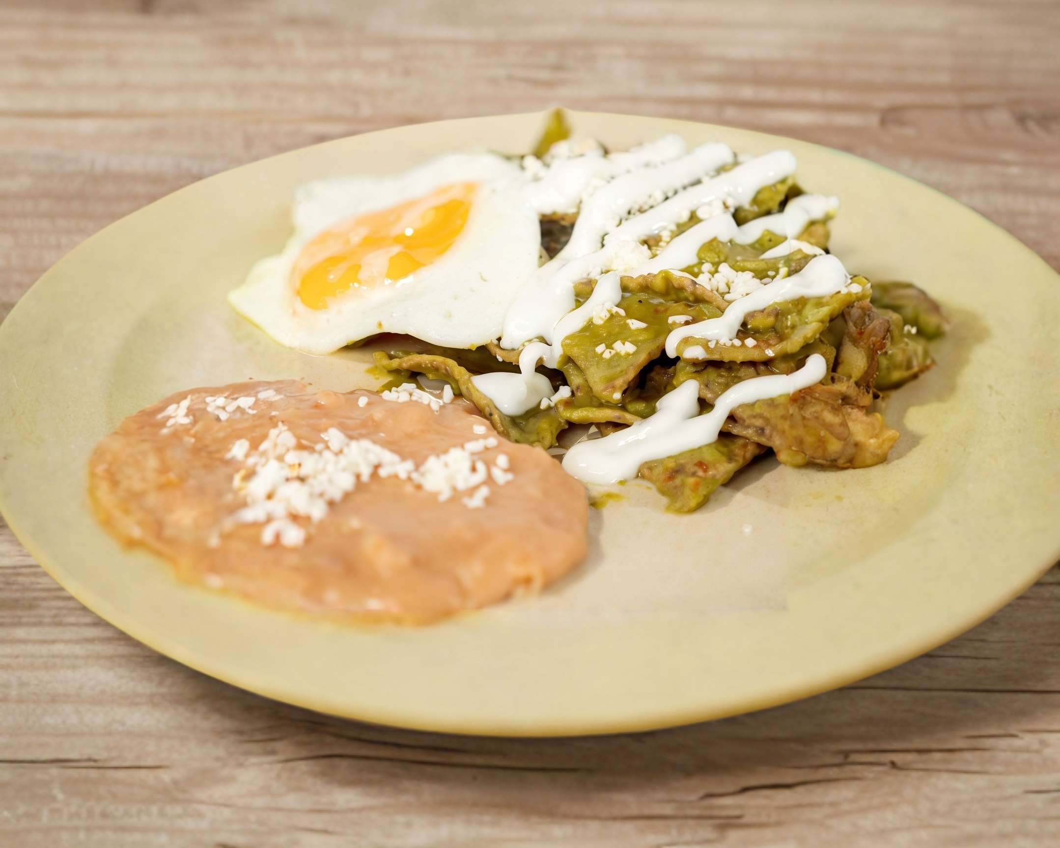 Porción de totopos bañados en salsa verde, con proteína a elegir, crema, queso y cebolla. Acompañados de frijoles fritos.