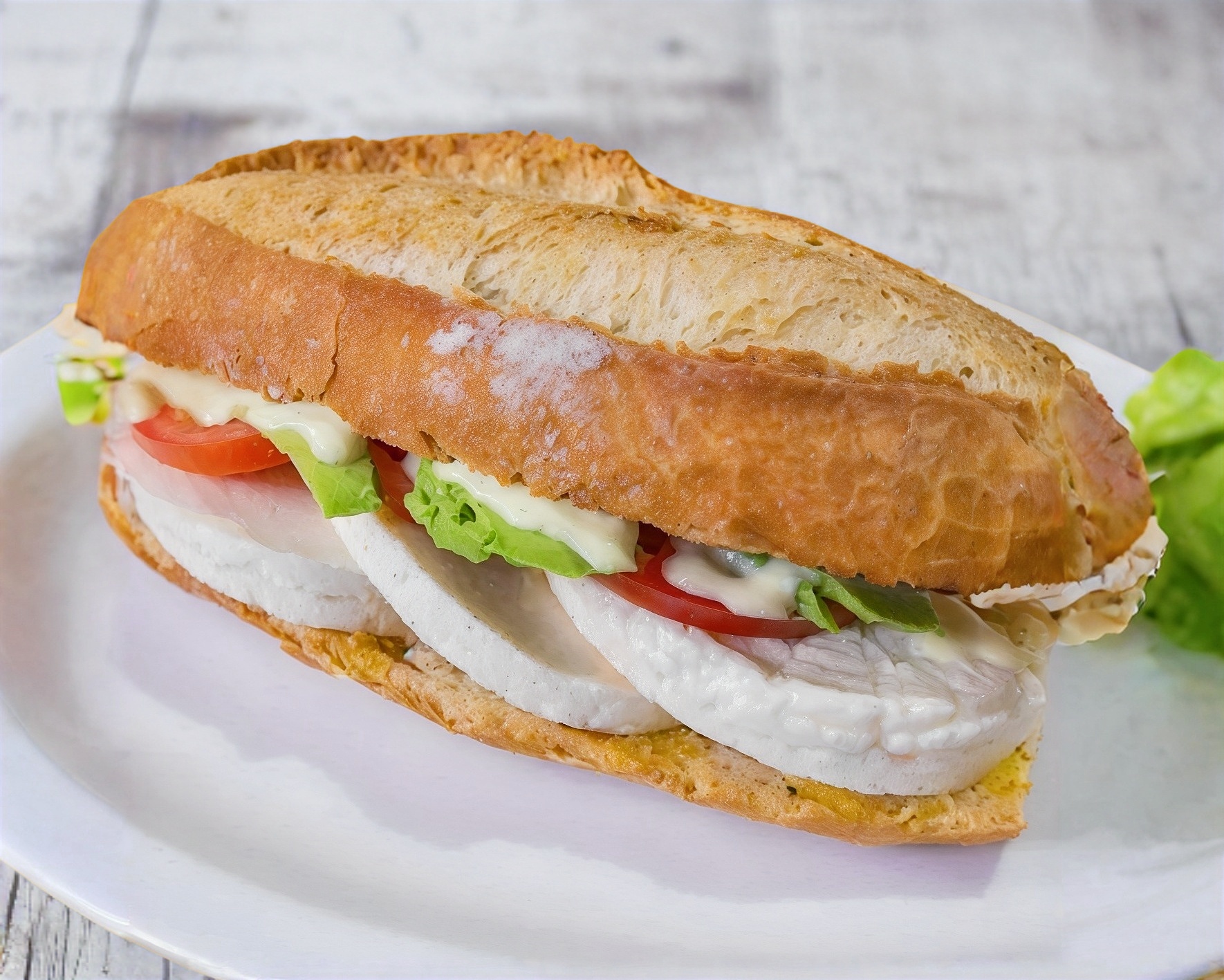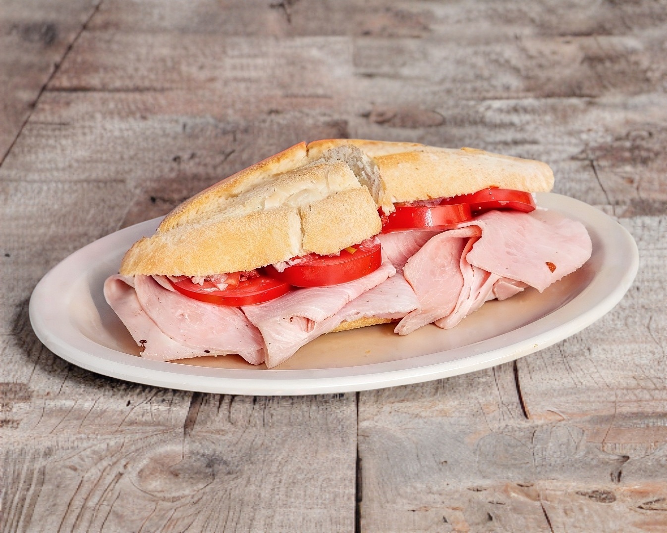 Bolillo freiman con jamón de pierna, de cerdo, crema, jitomate, cebolla y jalapeños.