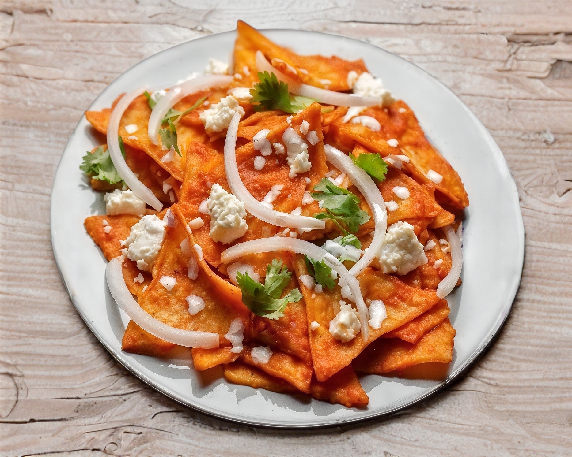 Porción de totopos bañados en salsa roja, con proteina a elegir, crema, queso y cebolla. Acompañados de frijoles fritos.