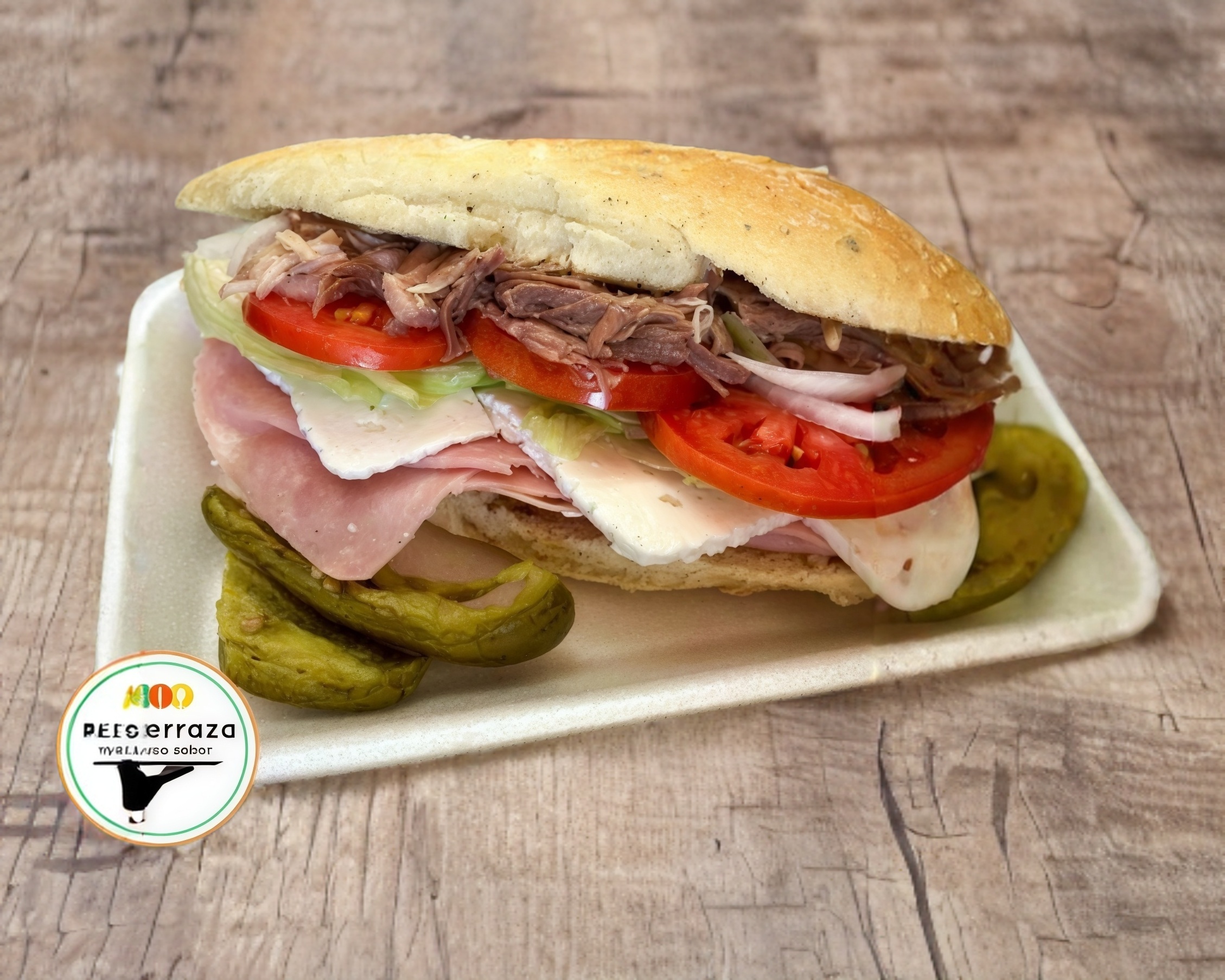 Bolillo fleiman con Pierna, Jamón y Panela, crema, jitomate, cebolla y jalapeños.