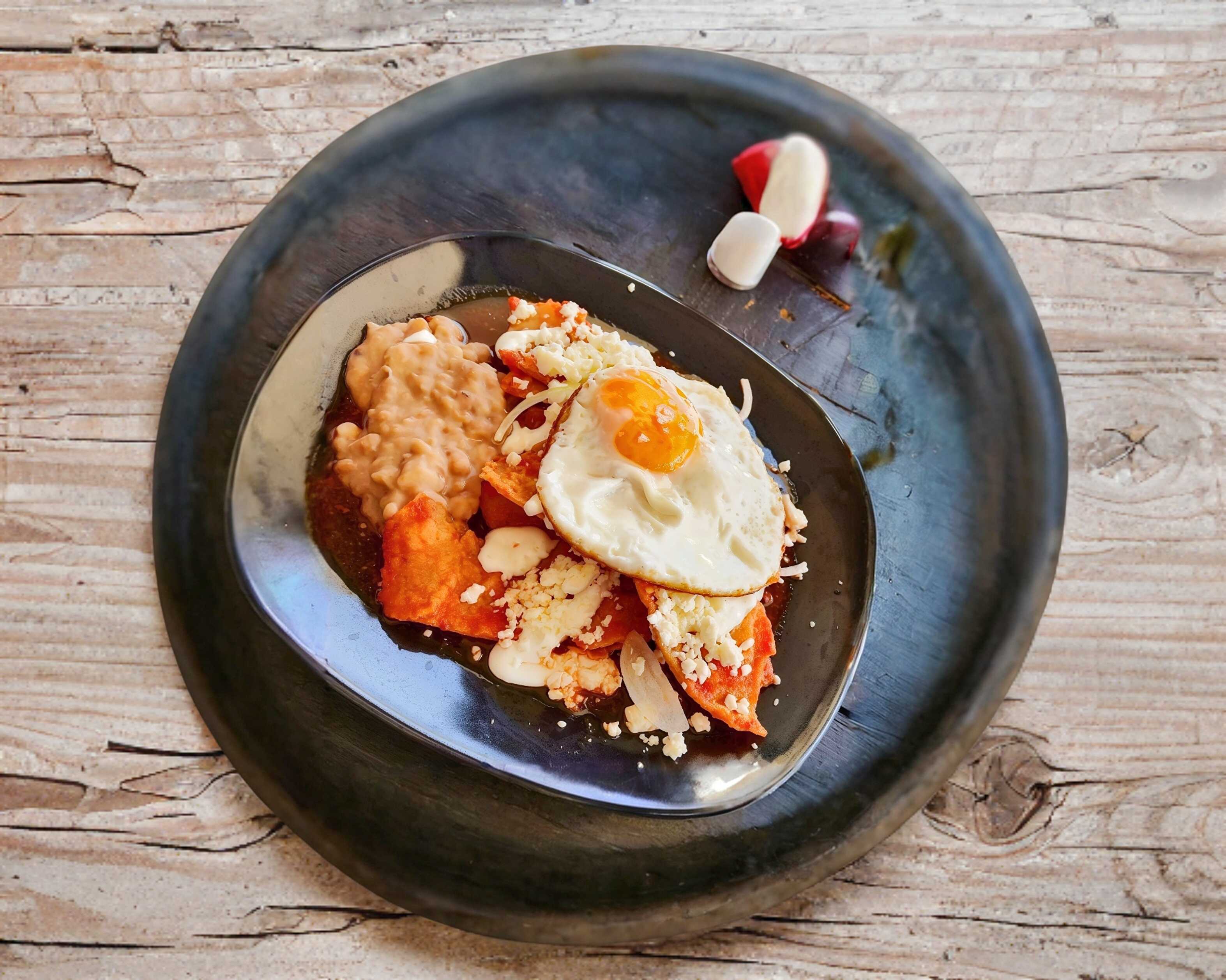 Porción individual de totopos bañados en salsa roja, crema, queso y cebolla. Acompañados de frijoles fritos.