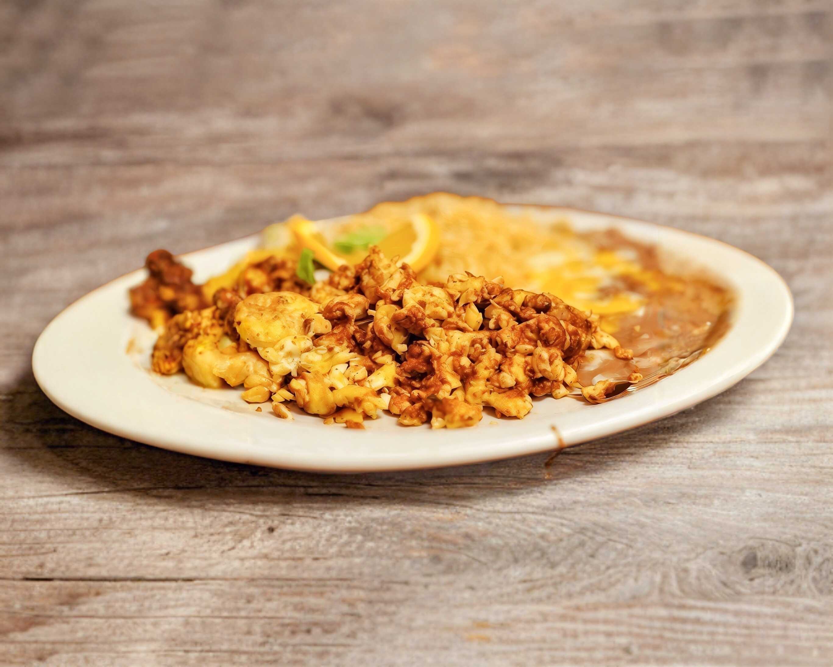 2 pzas de huevo revuelto con chorizo acompañado de una porción de frijoles con queso.