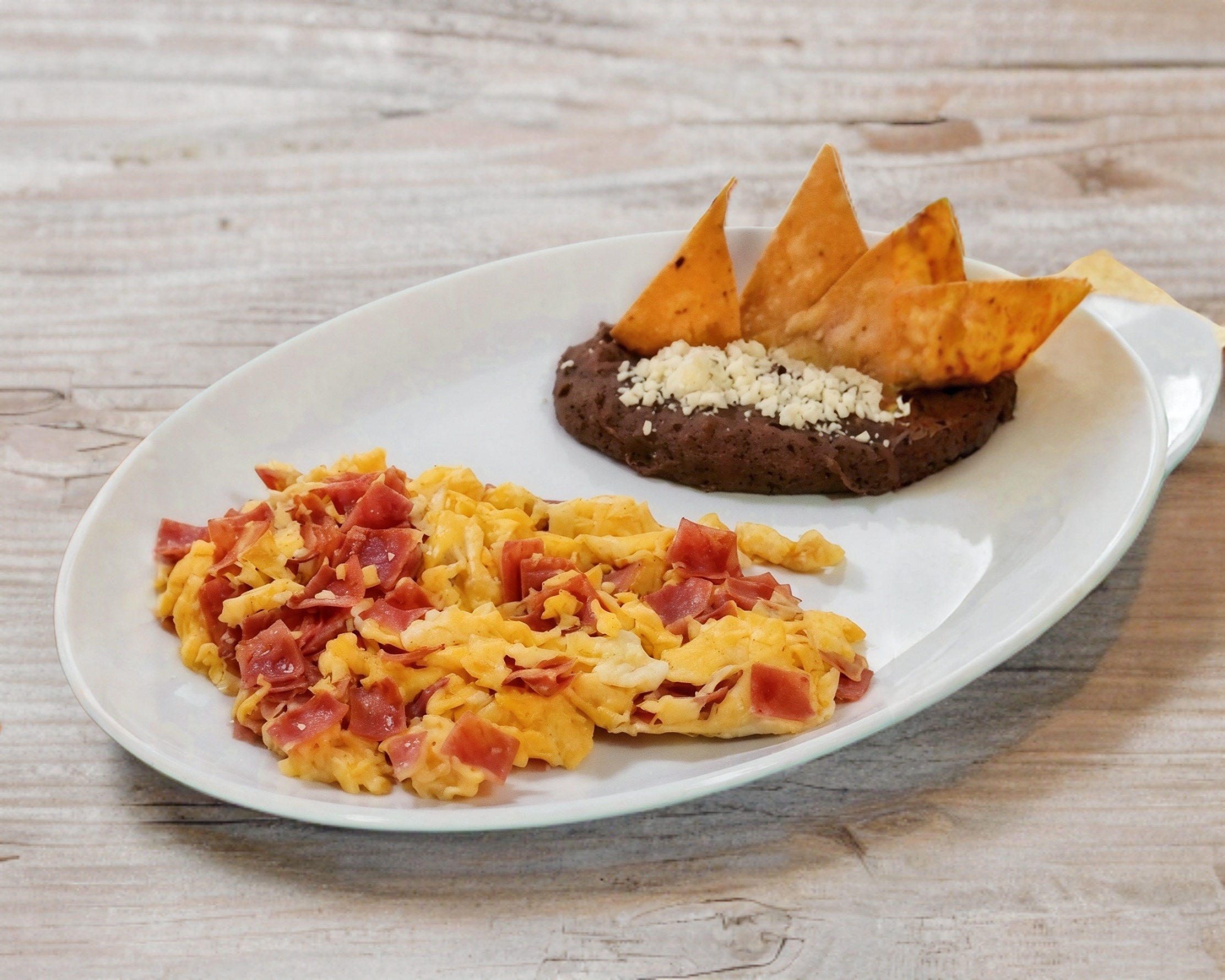 2 pzas de huevo revuelto con tocino acompañados de una porción de frijoles con queso.