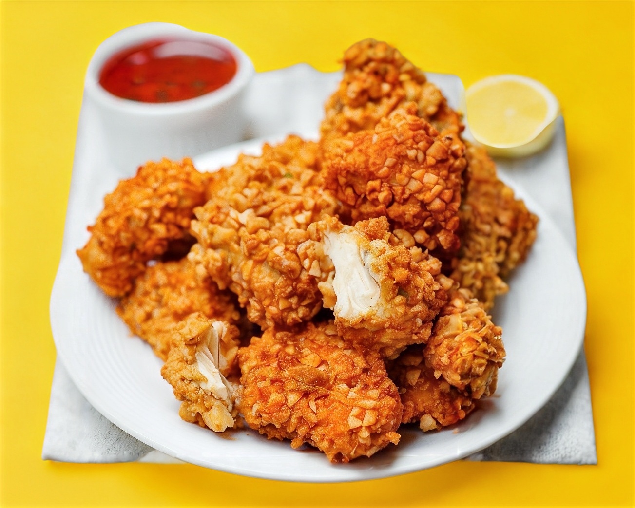 Deliciosa pechuga de pollo cubierta de fritura, bañados con la salsa o aderezo de tu eleccion. (250grs)