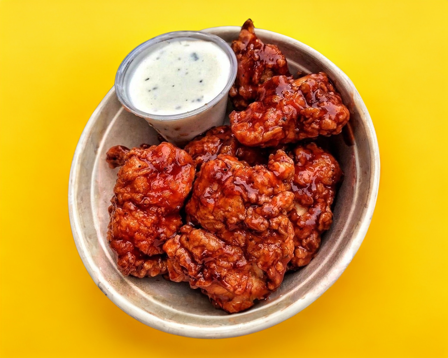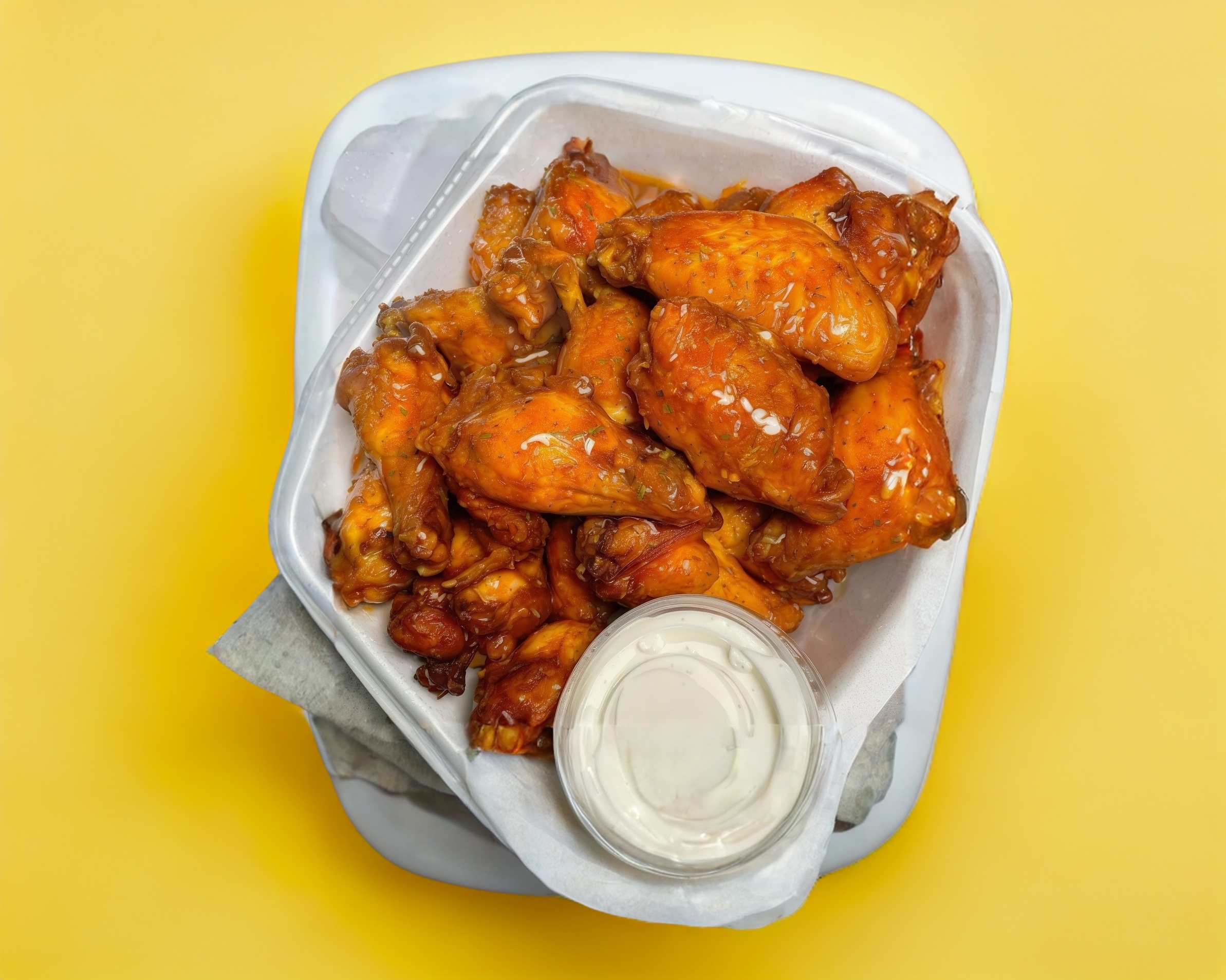 Deliciosas Alitas de pollo fritas, bañadas en la salsa de tu elección, acompañadas de una porción de aderezo ranch