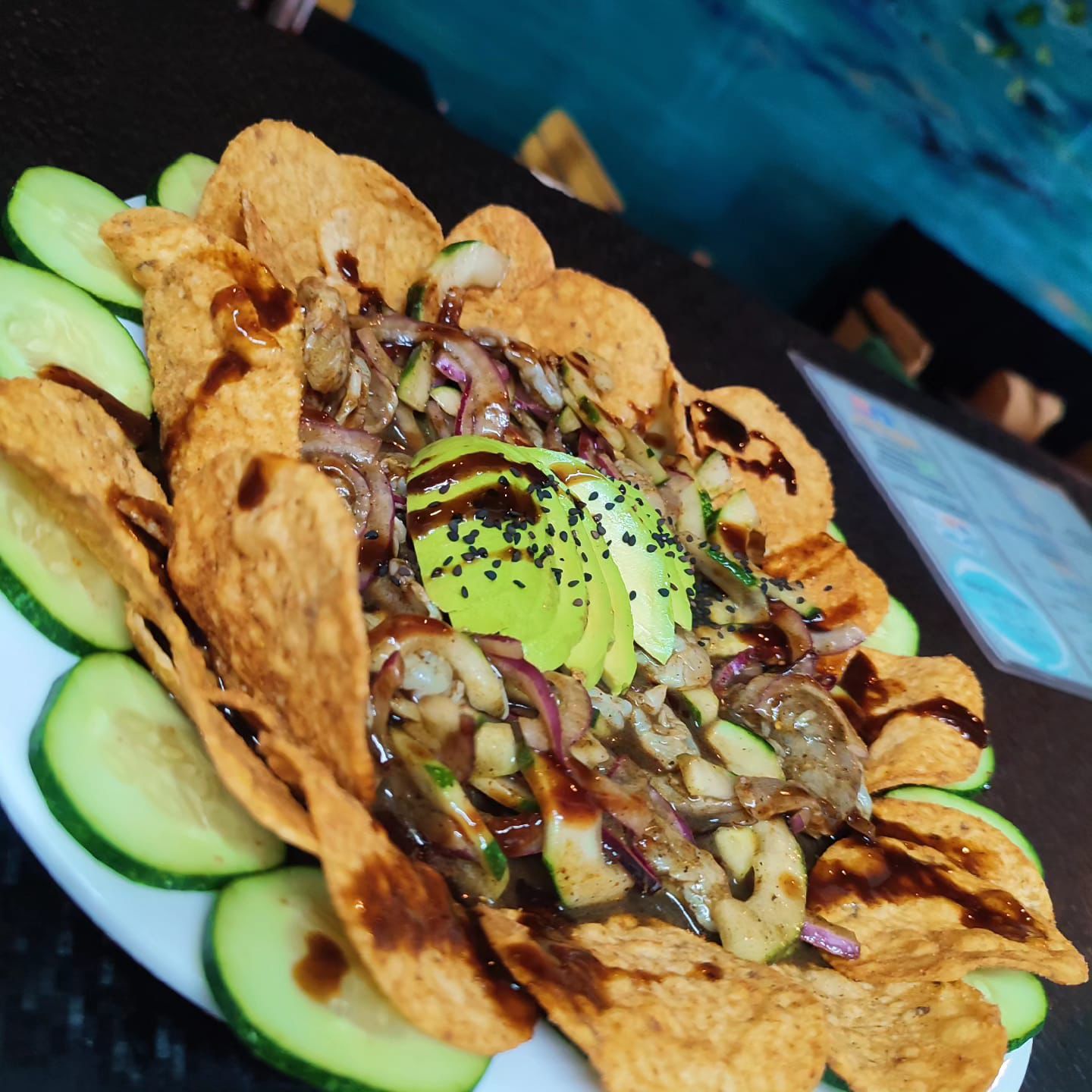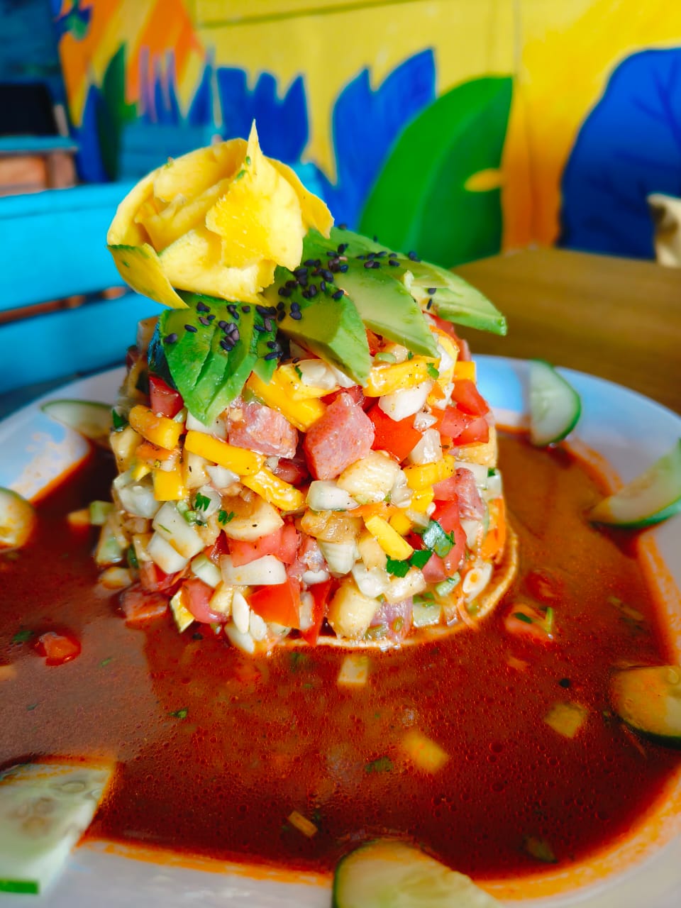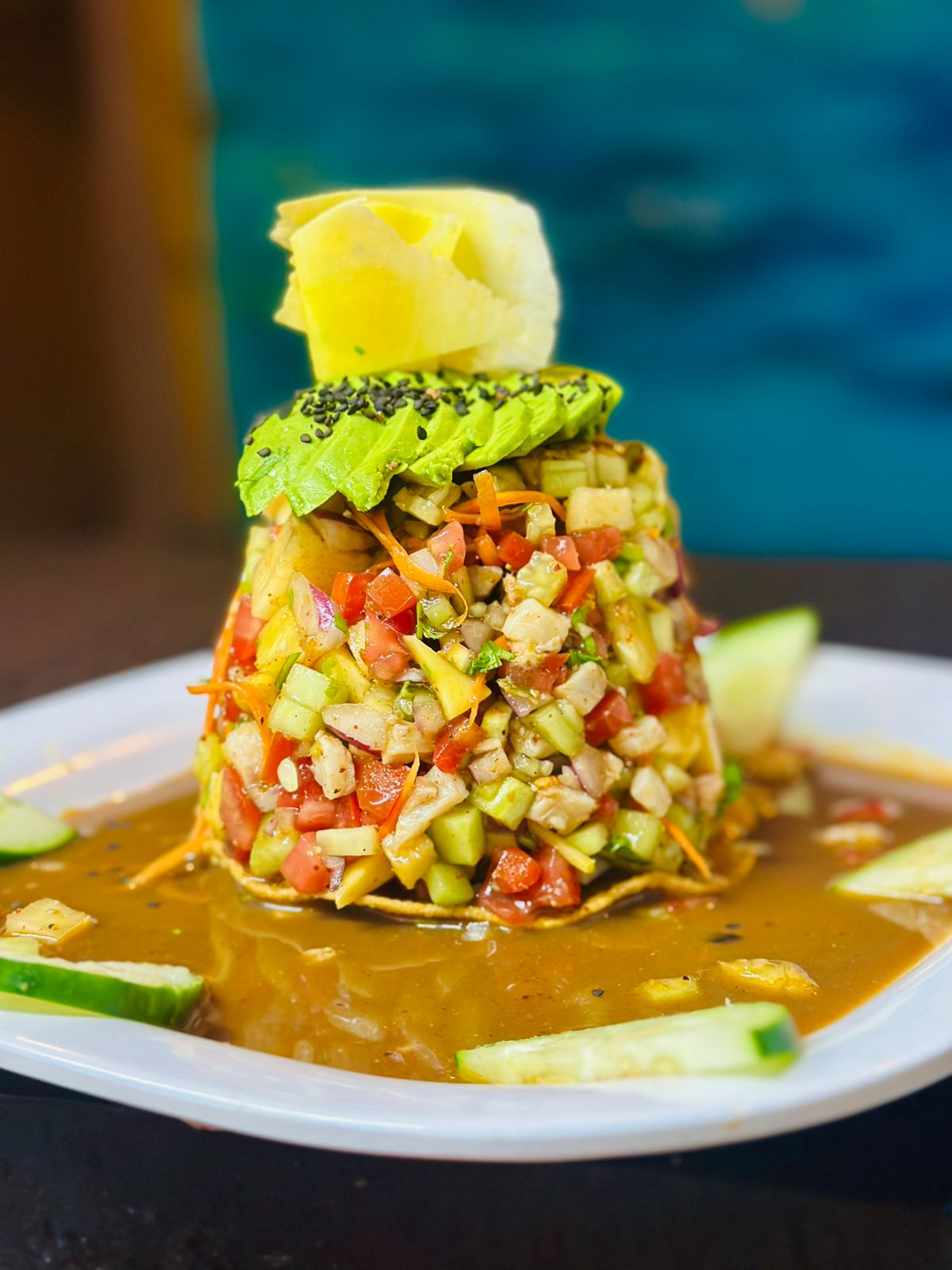 Trozos de pescado fresco, mezclados con el sabor tropical del mango y de la piña. Bañados en una salsa picante, coronados con aguacate.