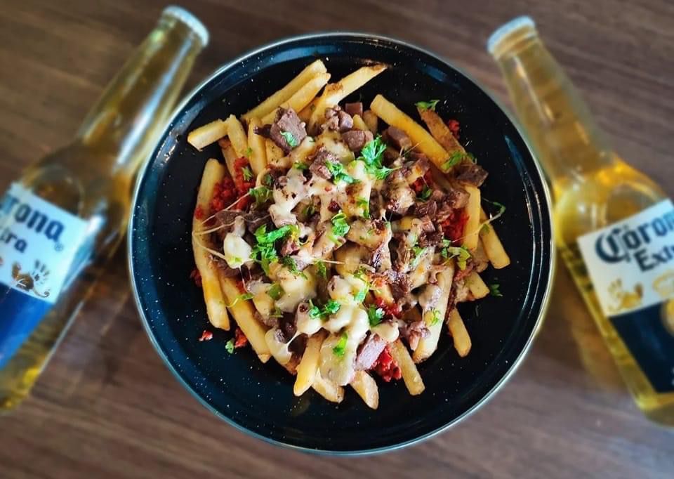 Papas a la francesa con arrachera, chorizo y queso gratinado.