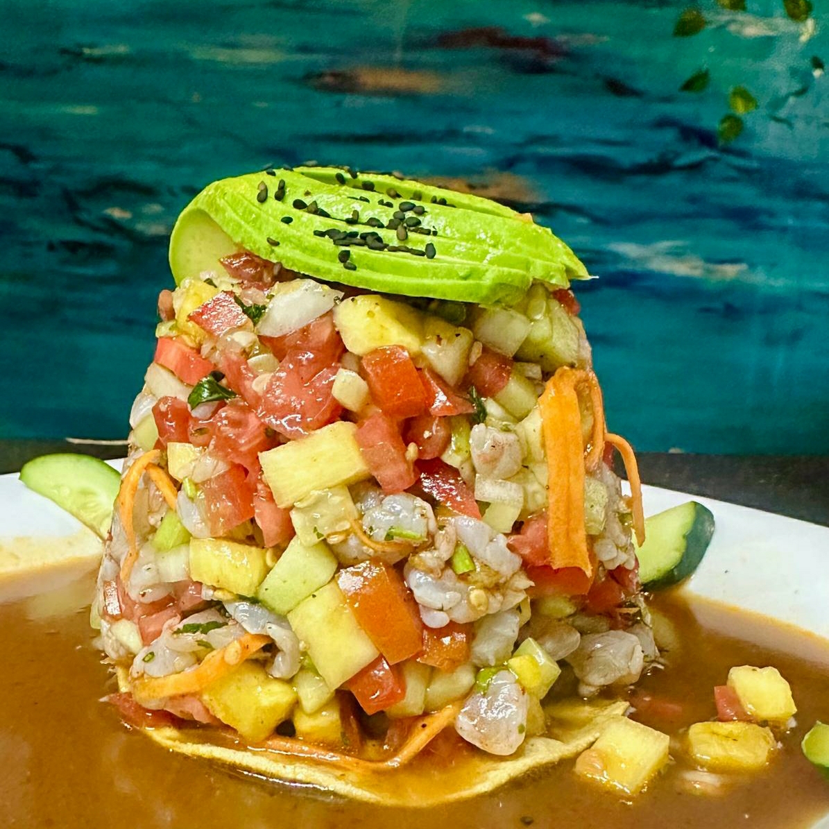 Trozos de camarón fresco, mezclados con el sabor tropical del mango y de la piña. Bañados en una salsa picante, coronados con aguacate.
