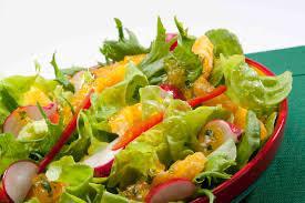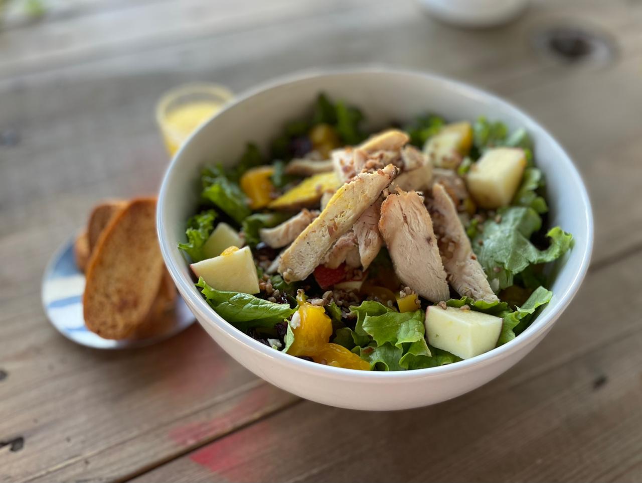 Mezcla de lechugas, apio, zanahoria, gajos de naranja, coco horneado, pollo, aderezo de citricos y aceite de olivo.