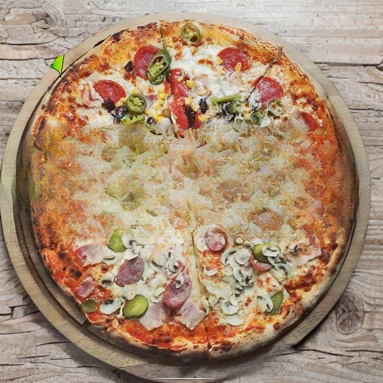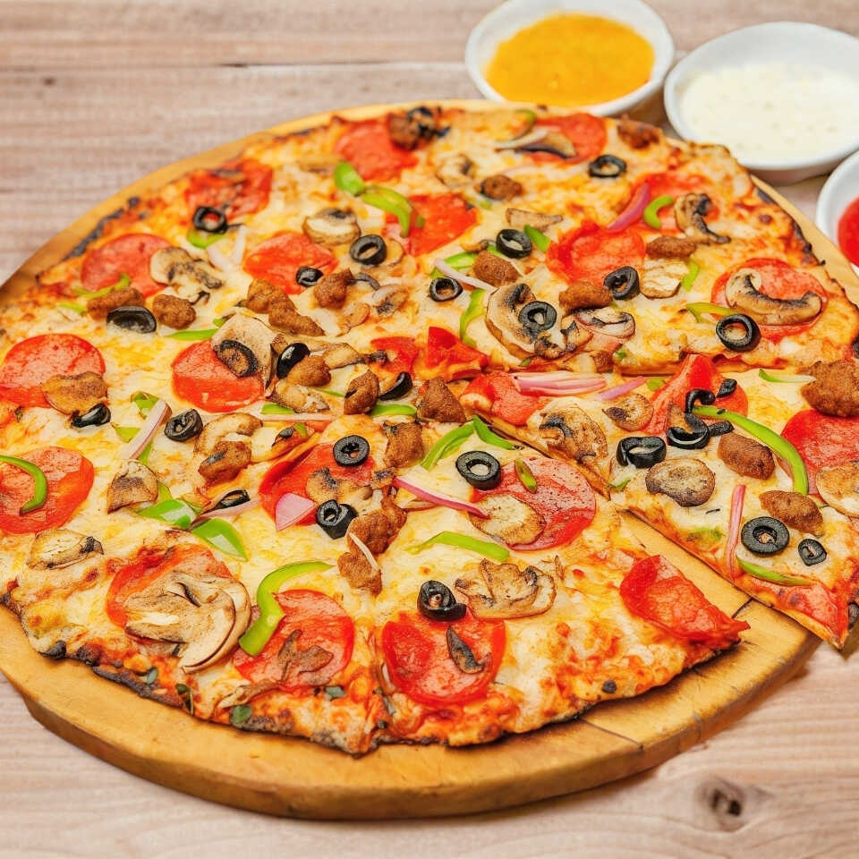 Cebolla, champiñones, pimientos, salchicha italiana, pepperoni y aceituna negra