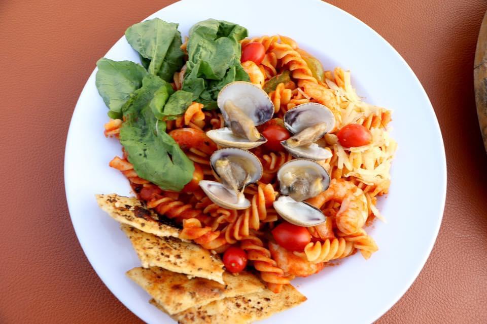 Camarón,almejas, aceite de olivo, pimiento, jitomate cherry,alcaparras,ajo,arugula y albahacar seca