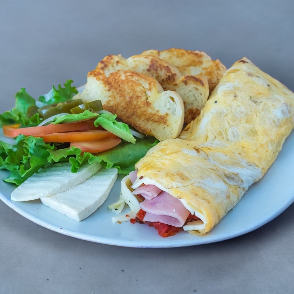 Jamón, Queso Amarillo, queso Blanco y Vegetales Frescos.