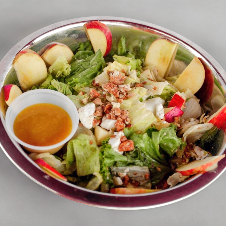 Mixtura de Lechugas y Espinacas, Manzana, Nuez Caramelizada, Queso de Cabra y aderezo de Mostaza con Miel. (No Incluye Proteína)