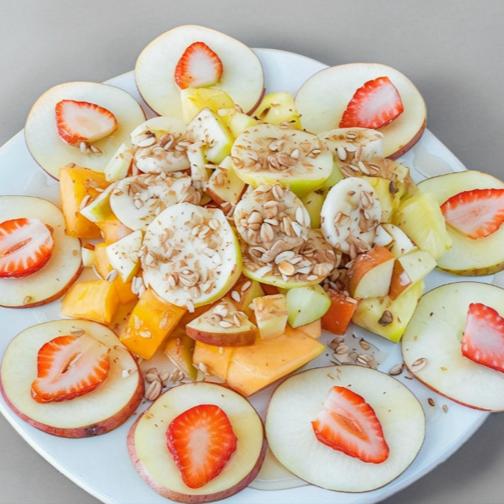 Todas las Frutas y cereales, Jugo de Naranja o Leche, Miel y Hielo