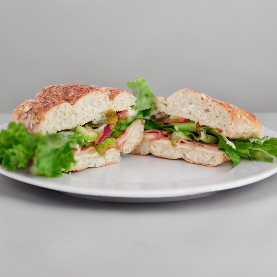 Vegetales Frescos: Lechuga, Jitomate, Cebolla, Aguacate, Y Chiles Jalapeños. Aderezos: Mayonesa y Mostaza. Jamón de Pavo, Queso Gouda, Manzana, Apio. En Telera Integral.