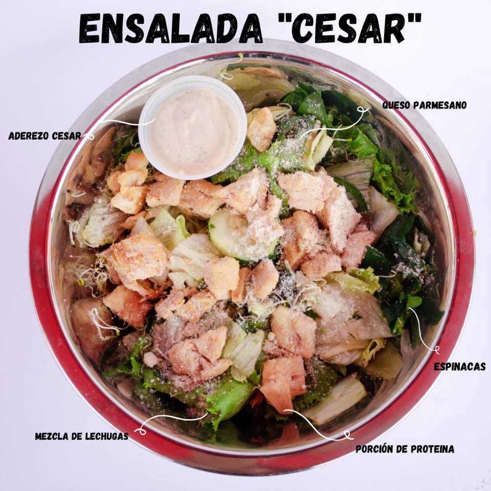 Espinacas y Mezcla de Lechugas, Bañadas con Aderezo César y Queso Parmesano más Porción de Proteína.