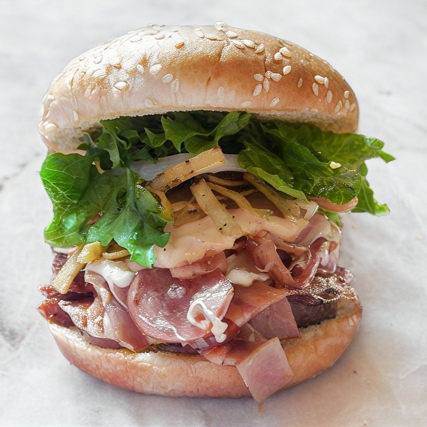 Carne de res 150g, jamón, salchicha, queso fundido y chipotle.