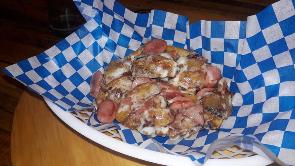 Papa gajo, salchicha, tocino y queso gratinado.