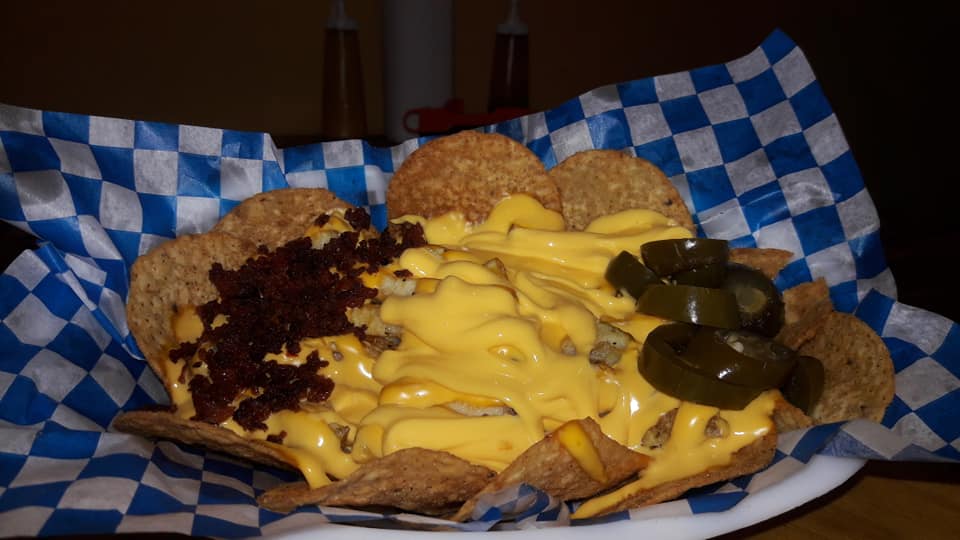Papas a la francesa, queso amarillo, chorizo, tostitos y jalapeños.