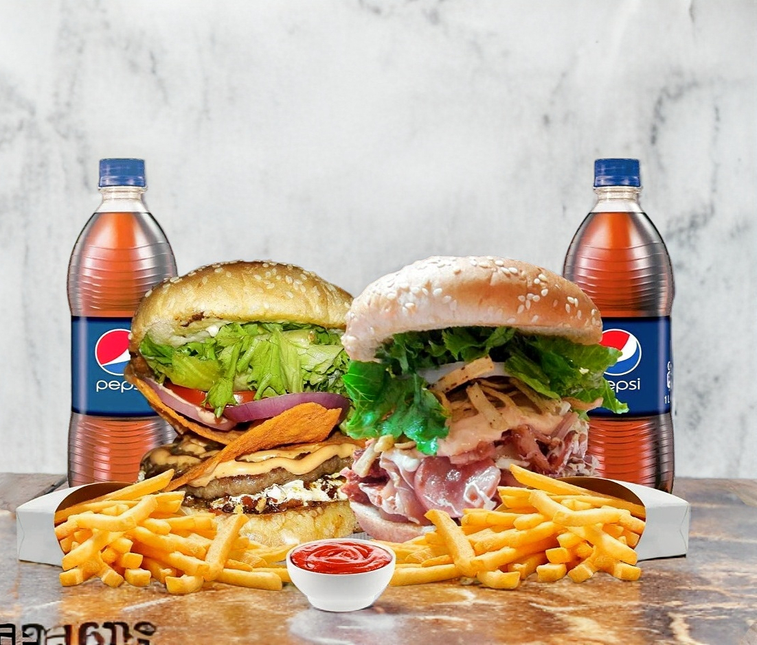 Elige 2 Hamburguesa a elegir acompañadas más papas - 2 Refrescos Coca cola.