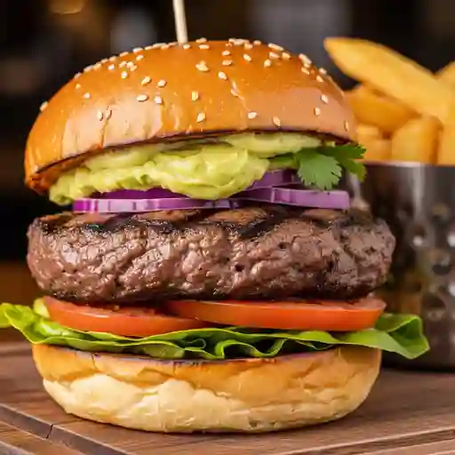 Hamburguesa con carne de arrachera, jamón, queso manchego, lechuga, jitomate, cebolla y papita.
