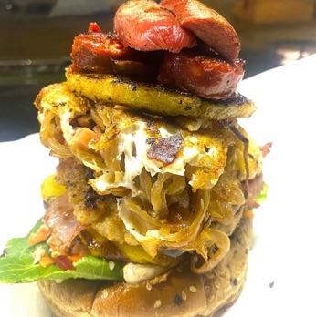 Hamburguesa con carne de res, jamón, aros de cebolla, champiñones, tocino, queso gratinado y huevo.