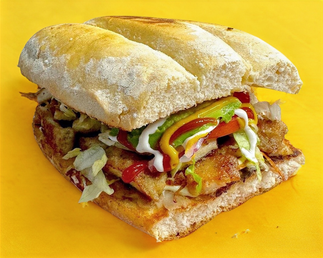 Torta de Milanesa Res 100g,queso Oaxaca 25g de frijoles, lechuga,jitomate,cebolla y aguacate, salsa jalapeño o chipotle