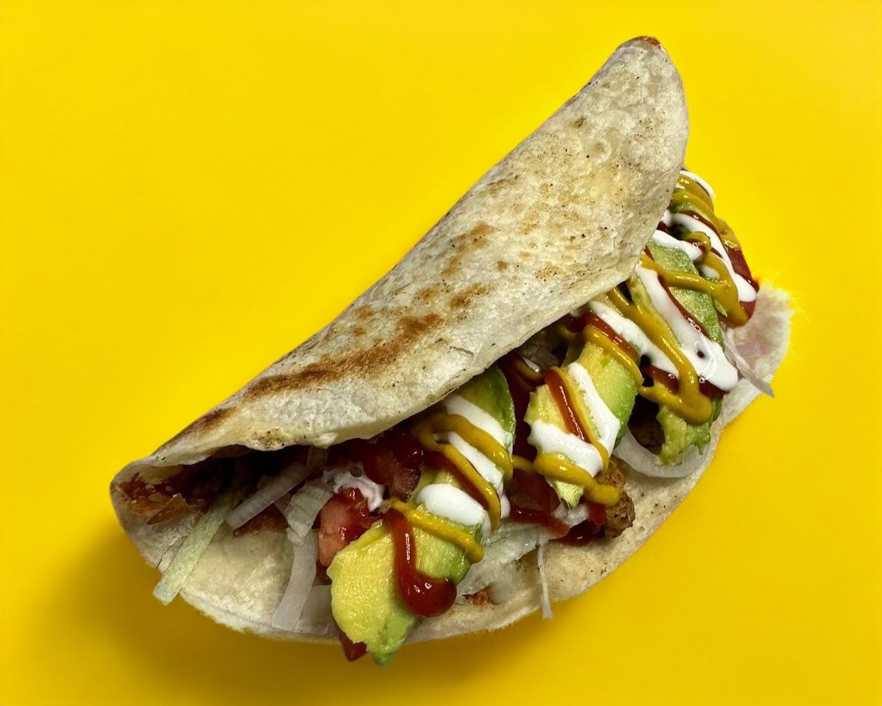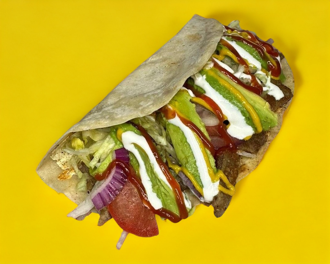 Tortilla de harina,queso Oaxaca,milanesa,lechuga,jitomate,cebolla y aguacate