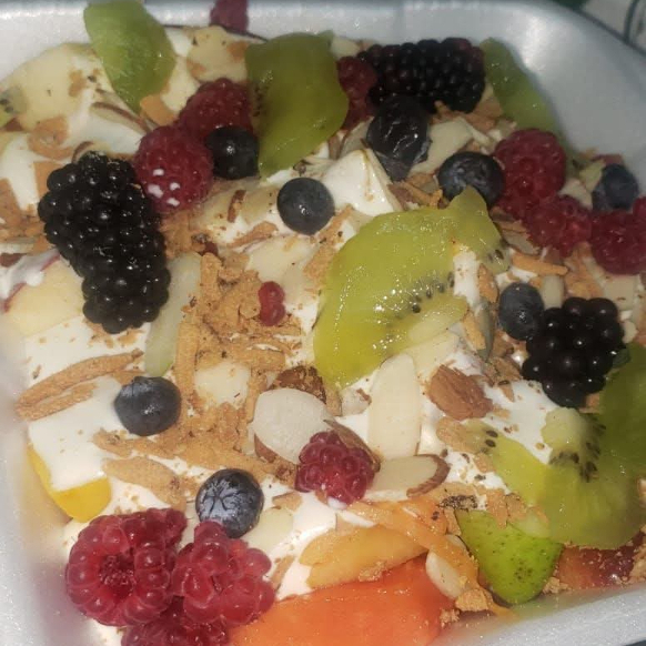 Papaya-manzana verde-manzana roja-platano-melon-pera-uva-frutos rojos-fresa-kiwi. Crema gourmet
