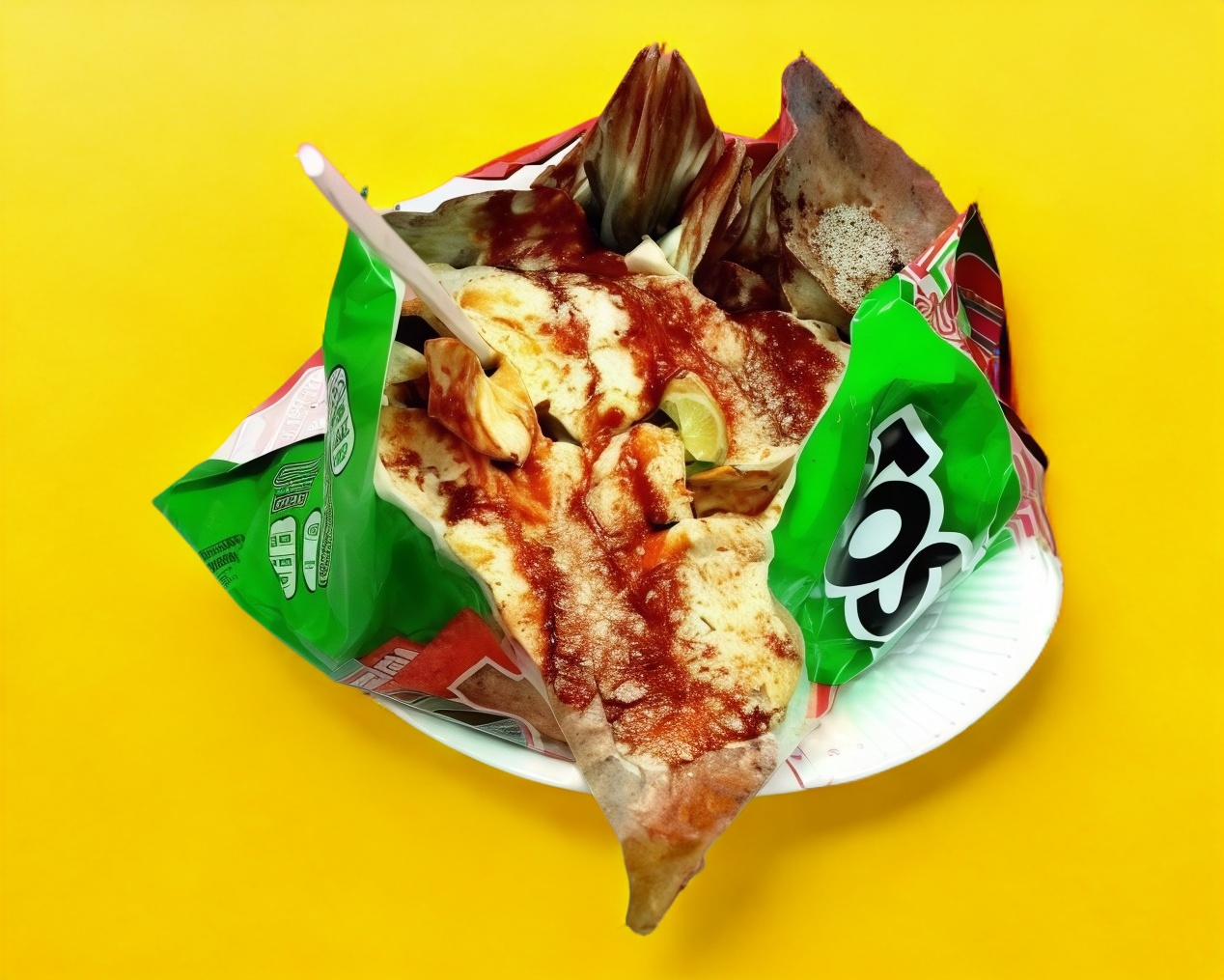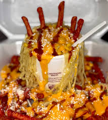 Maruchan preparada con papas a elegir, elote, crema, queso, queso amarillo y limón