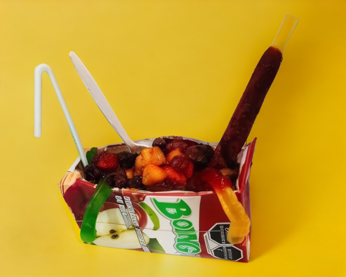 Boing Congelado con gomitas, miguelito, chamoy y limón.