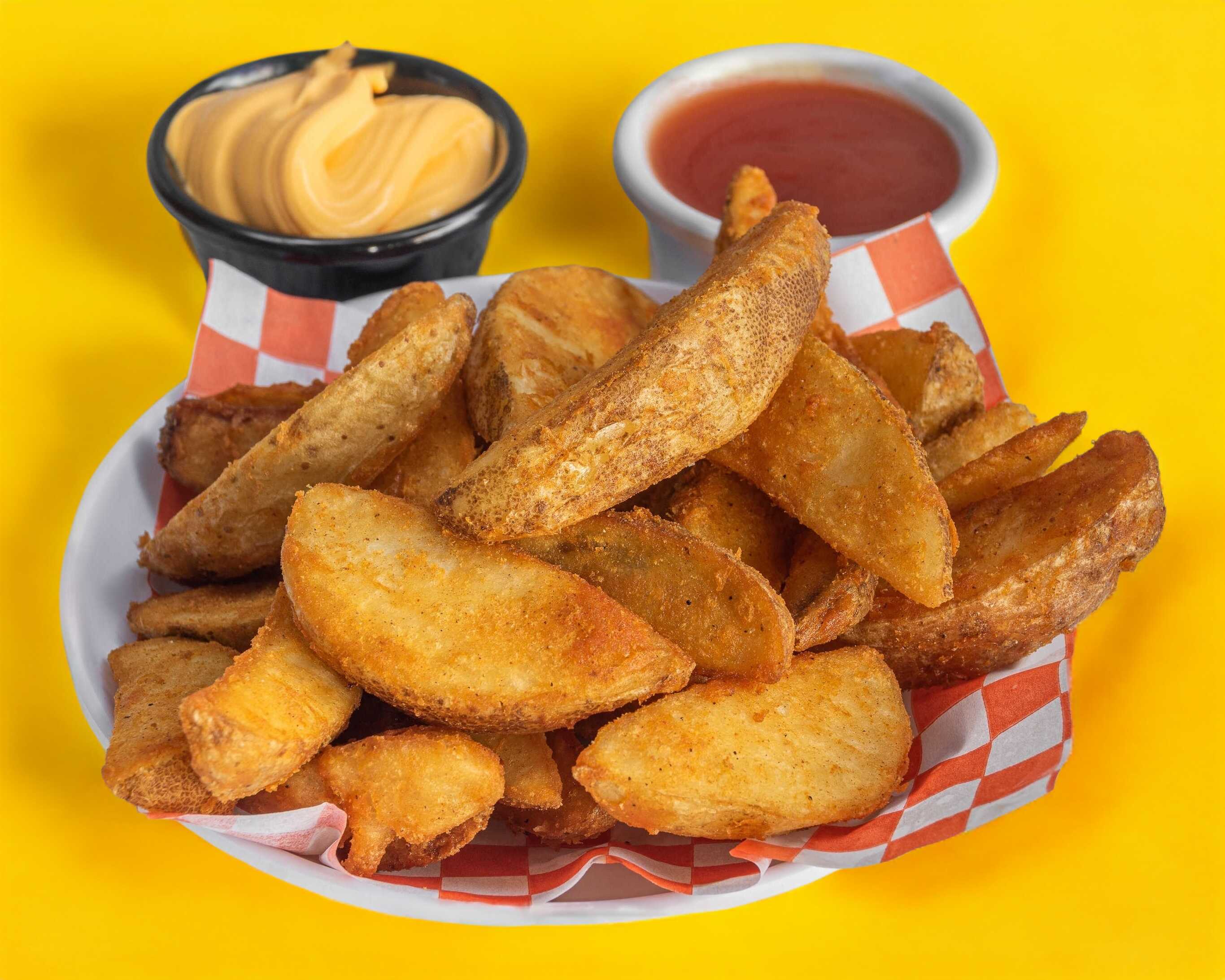 Papas en gajos doradas al estilo casero. Acompañado de aderezo ranch.