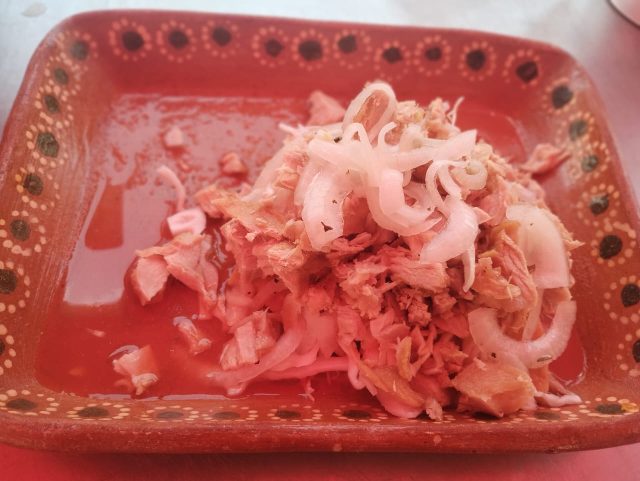 Torta con carne de lengua. Ingredientes: salsa, picante, cebolla y limón
