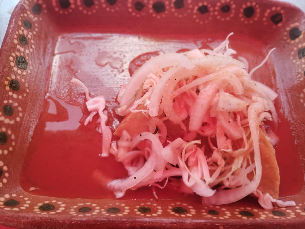 Taco dorado de papa o frijol con carne arriba, acompañado de salsa de torta, chile, cebolla, col y limón.