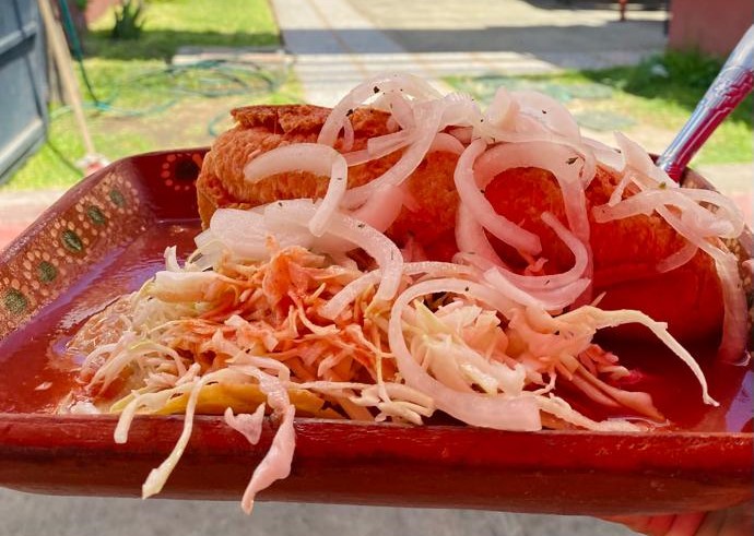 Torta de buche, acompañada de salsa, chile de torta, cebolla y limón.