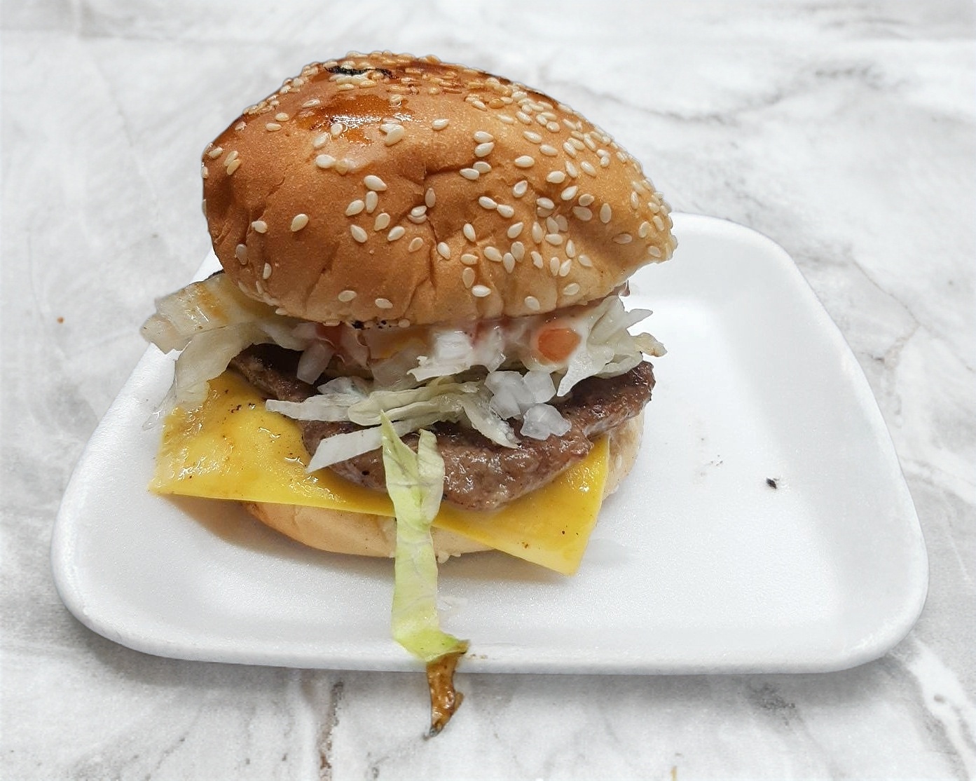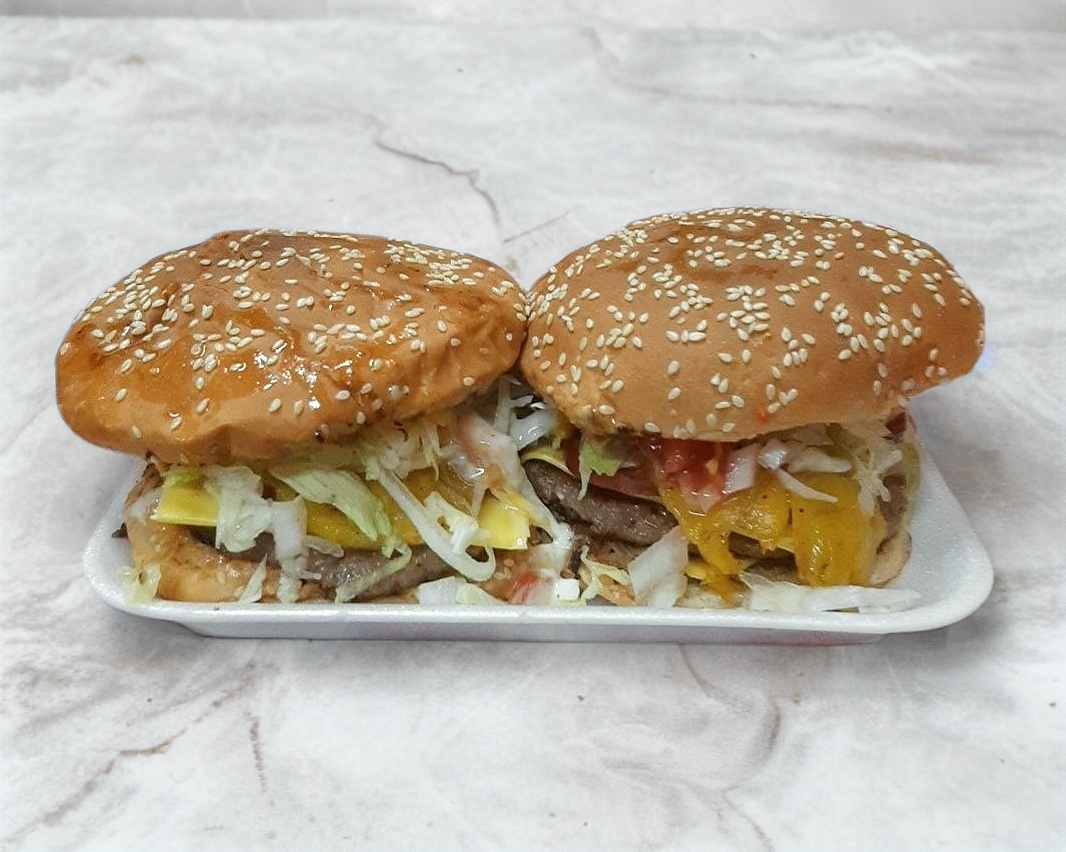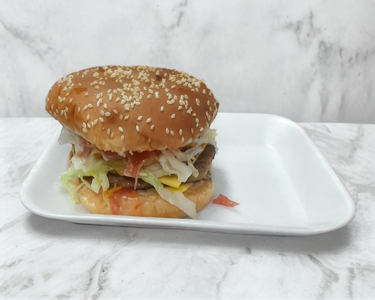 Pan mediano con carne de res con doble queso lechuga jitomate cebolla catsup mostaza y aderezo cesar
