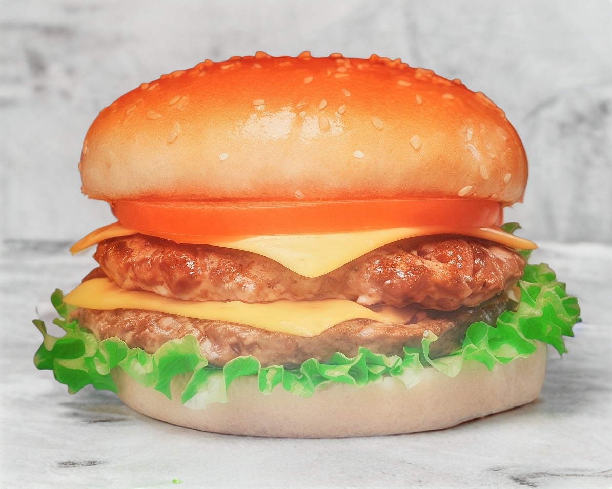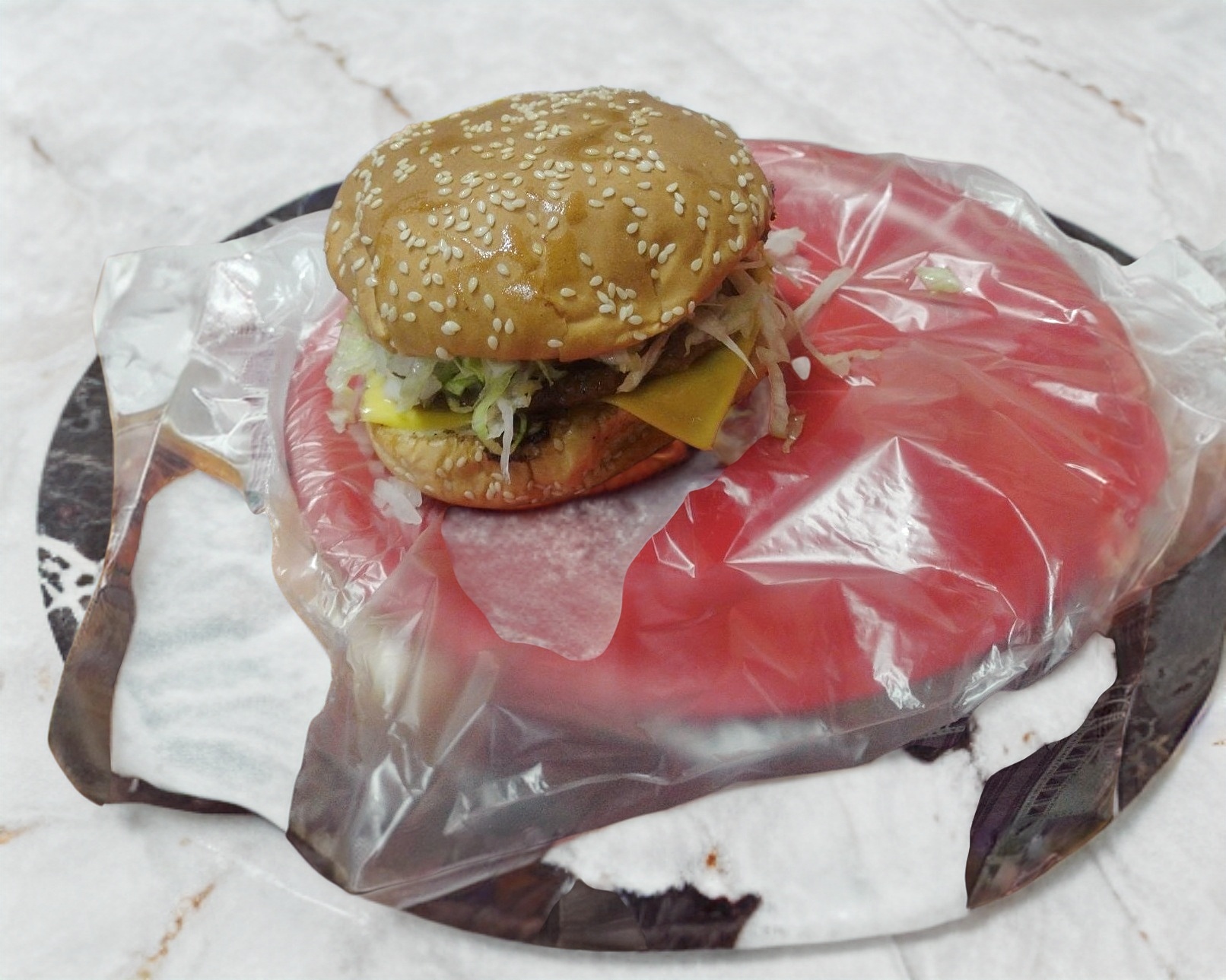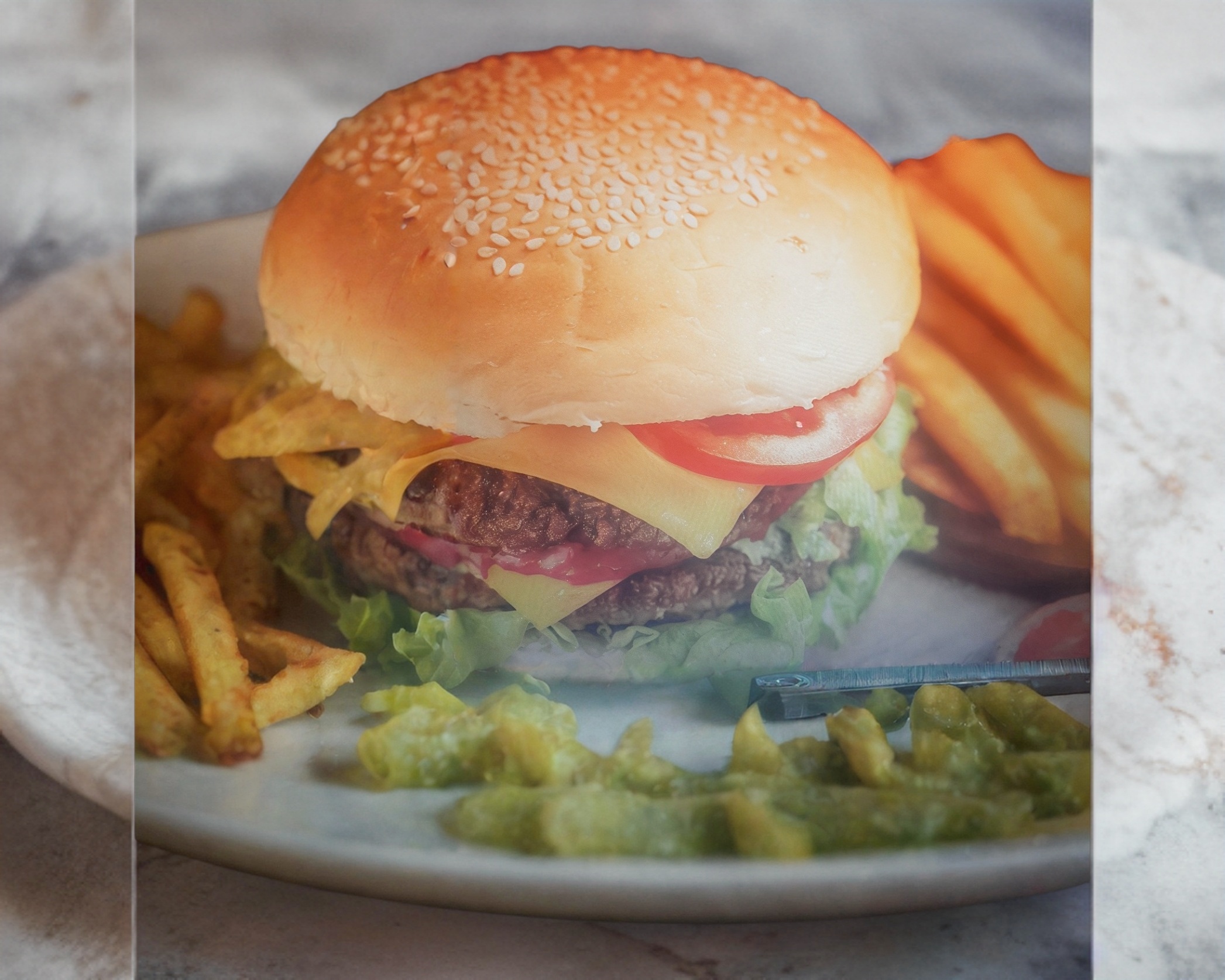Pan mediano con carne de res con doble queso lechuga jitomate cebolla catsup mostaza y aderezo cesar