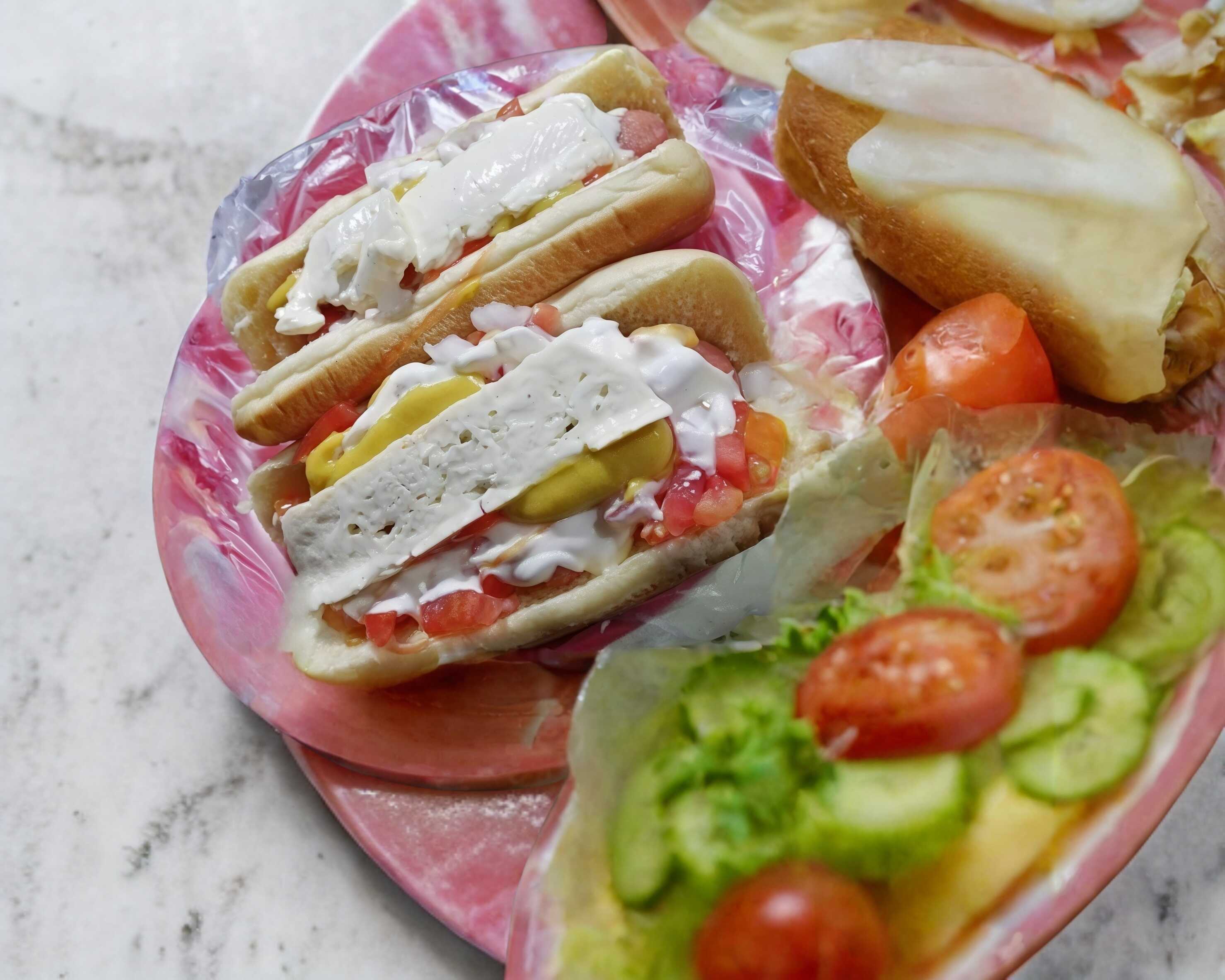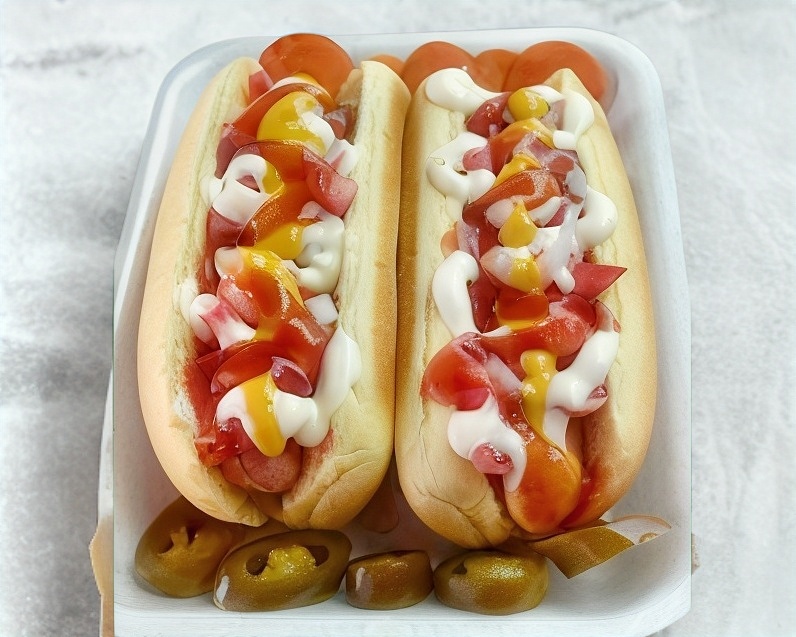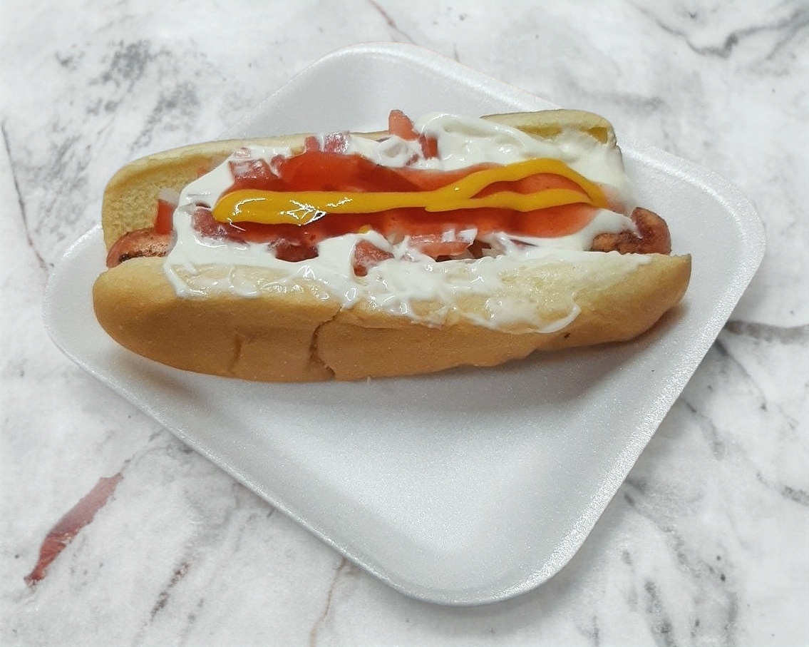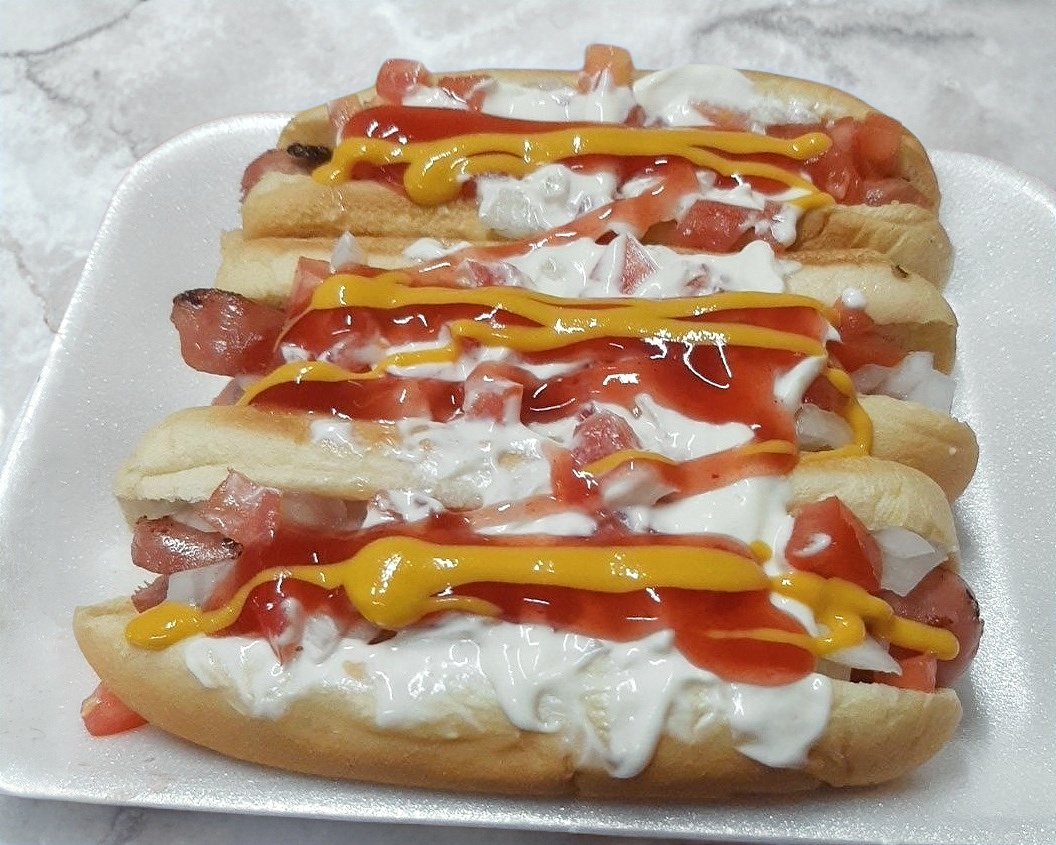 3 hot dogs salchicha con tocino, cebolla, jitomate, crema, cátsup, mostaza